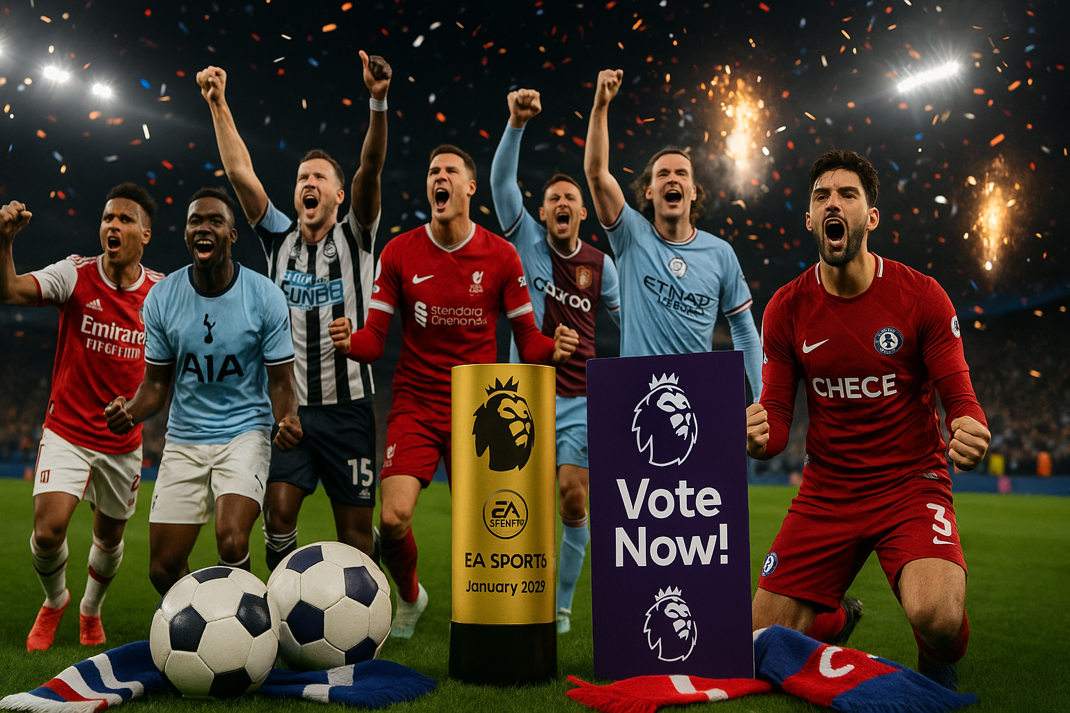 Realistic illustration of celebrating Premier League players nominated for EA SPORTS Player of the Month award in January 2026, with trophy and voting graphics.