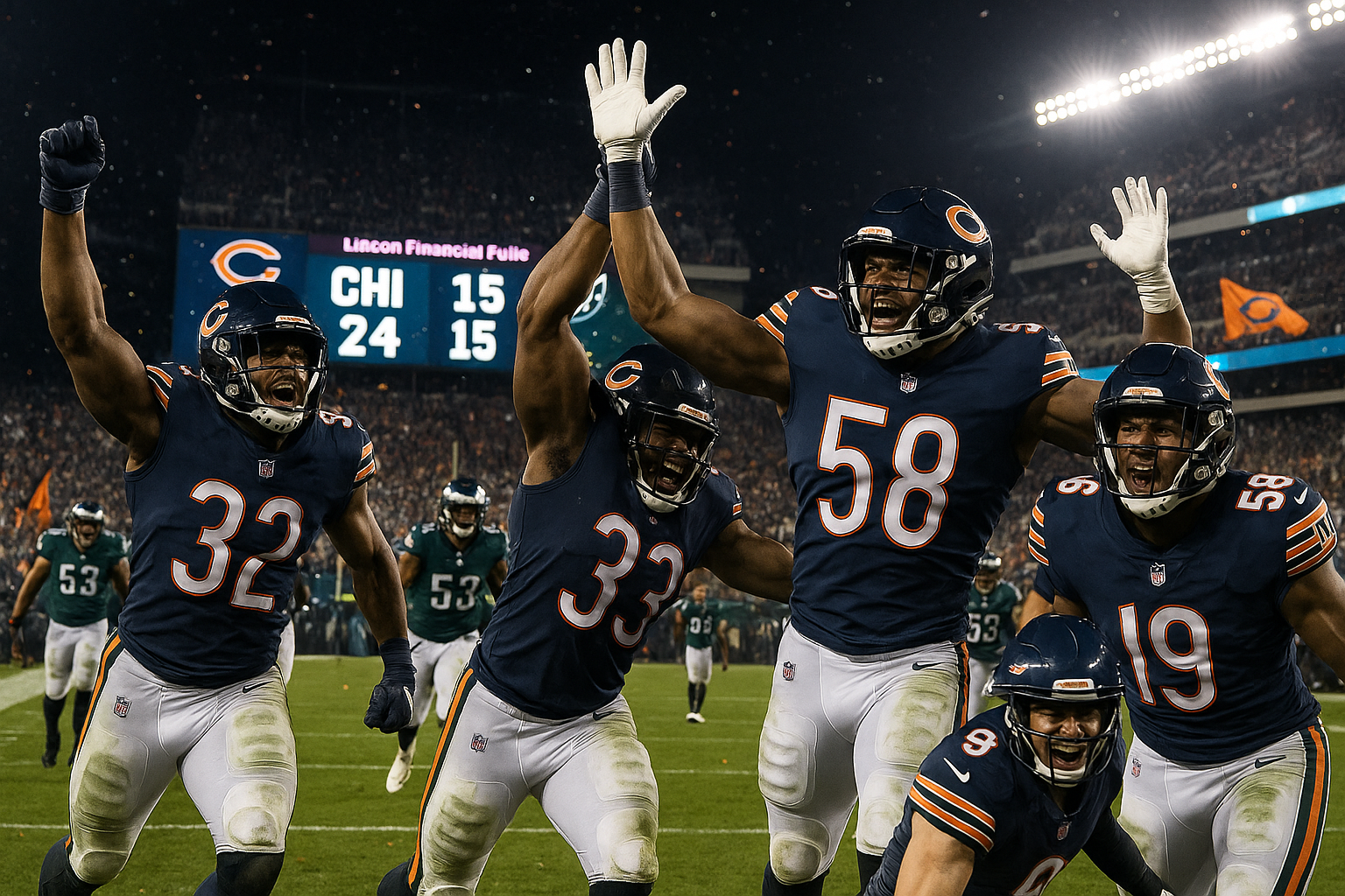 The Chicago Bears defeated the Philadelphia Eagles 24-15 in the 2025 NFL Black Friday Game at Lincoln Financial Field. Both teams entered with 8-3 records, but the Bears pulled off the upset to improve to 9-3 while dropping the Eagles to 8-4. Key plays included touchdown runs and passes that secured the victory for Chicago.