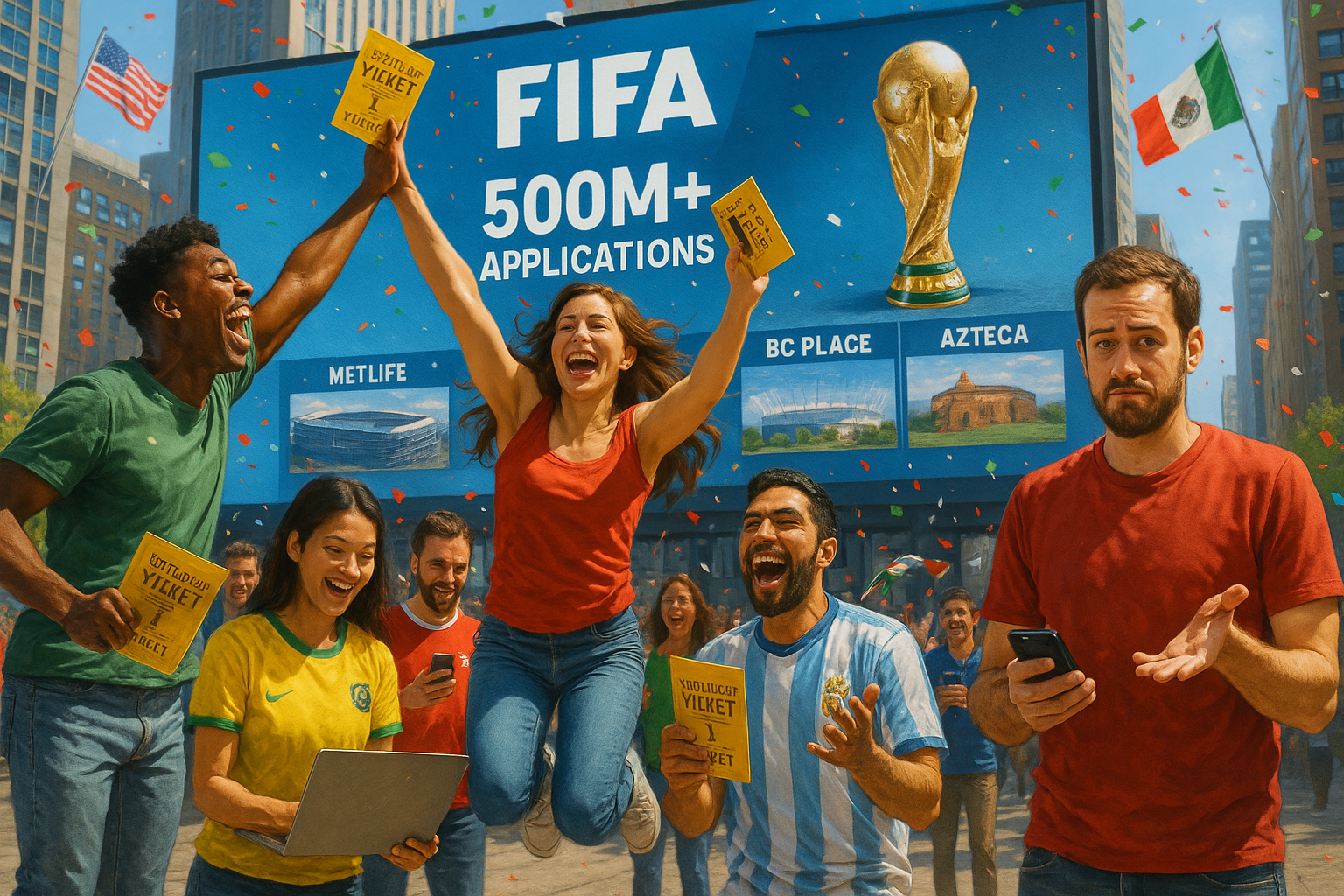 Illustration of global fans celebrating over 150 million ticket requests for the 2026 FIFA World Cup in North America.