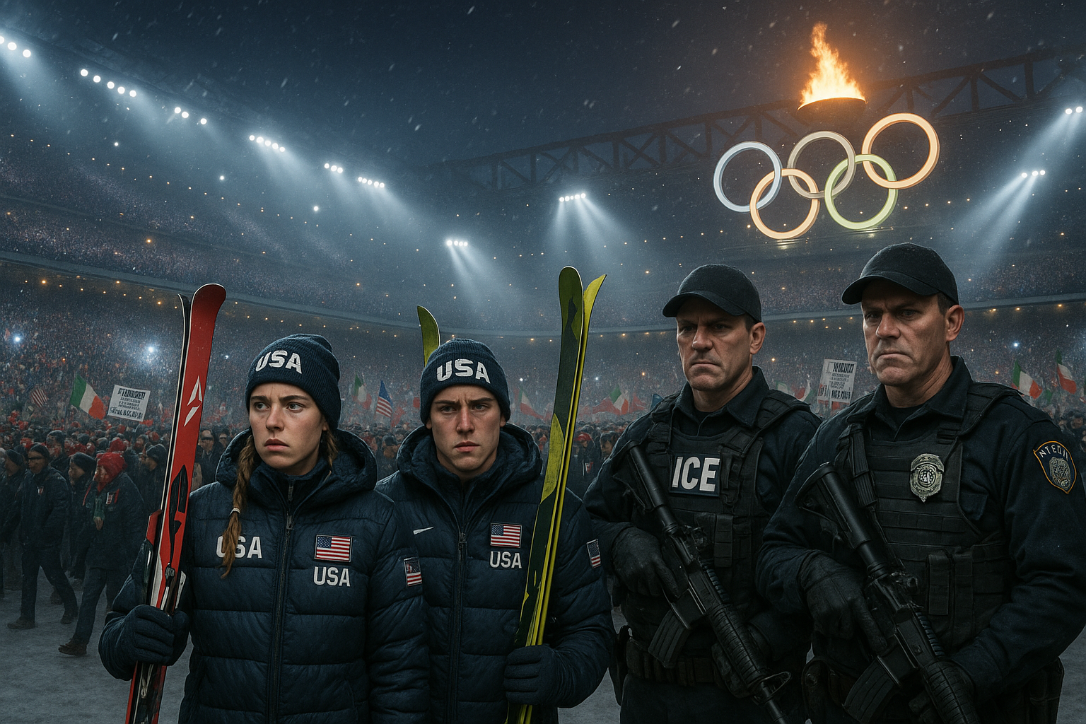 Dramatic illustration of U.S. ICE security guarding athletes at the Milano Cortina Olympics opening amid political tensions.