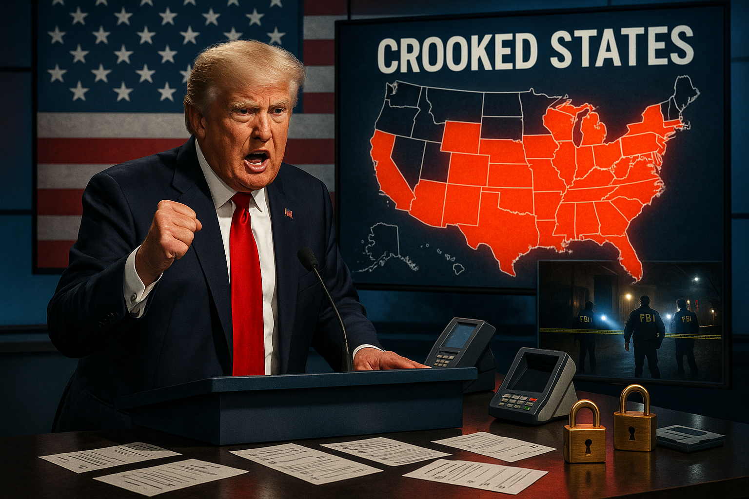 Illustration of Trump urging nationalized voting in 'crooked' states amid FBI Georgia raid, with U.S. map, ballots, and raid scene.