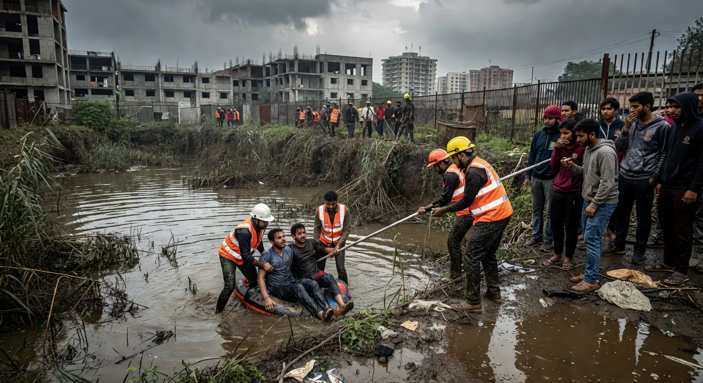 Rescue operation at a waterlogged construction pit in Noida Sector 94 where an Amity University student drowned during a celebration with friends.