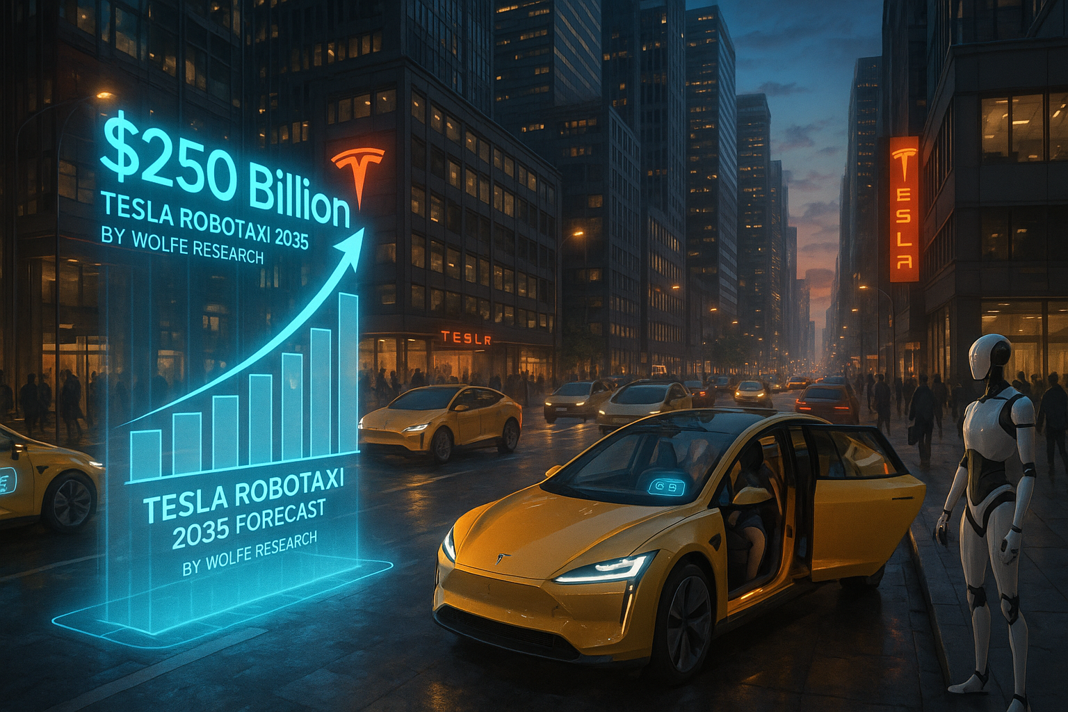 Illustration of Tesla robotaxis in a futuristic city with a holographic $250 billion revenue projection for 2035.