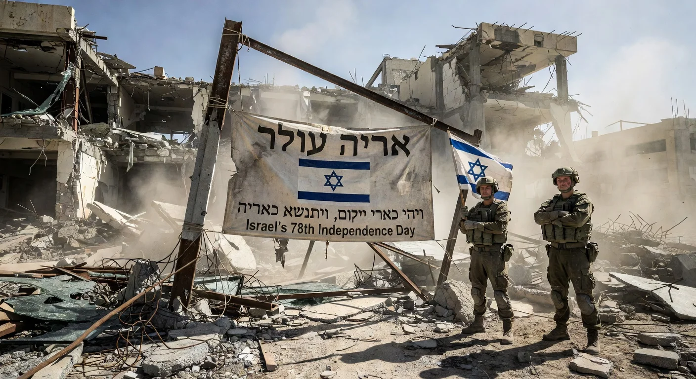 The 'Rising Lion' banner references a Torah verse and the name of Israel's 2025 military operation against Iran. The display coincided with Israel's 78th Independence Day, marking 78 years since its 1948 declaration.