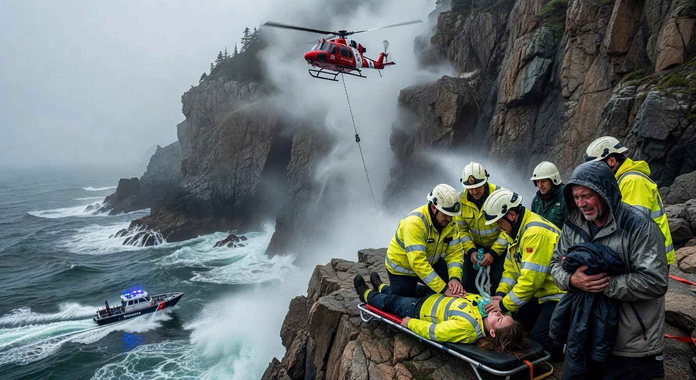 Dramatic rescue scene at a Salem cliff fall site, showing helicopter, boat, and first responders aiding the victim.